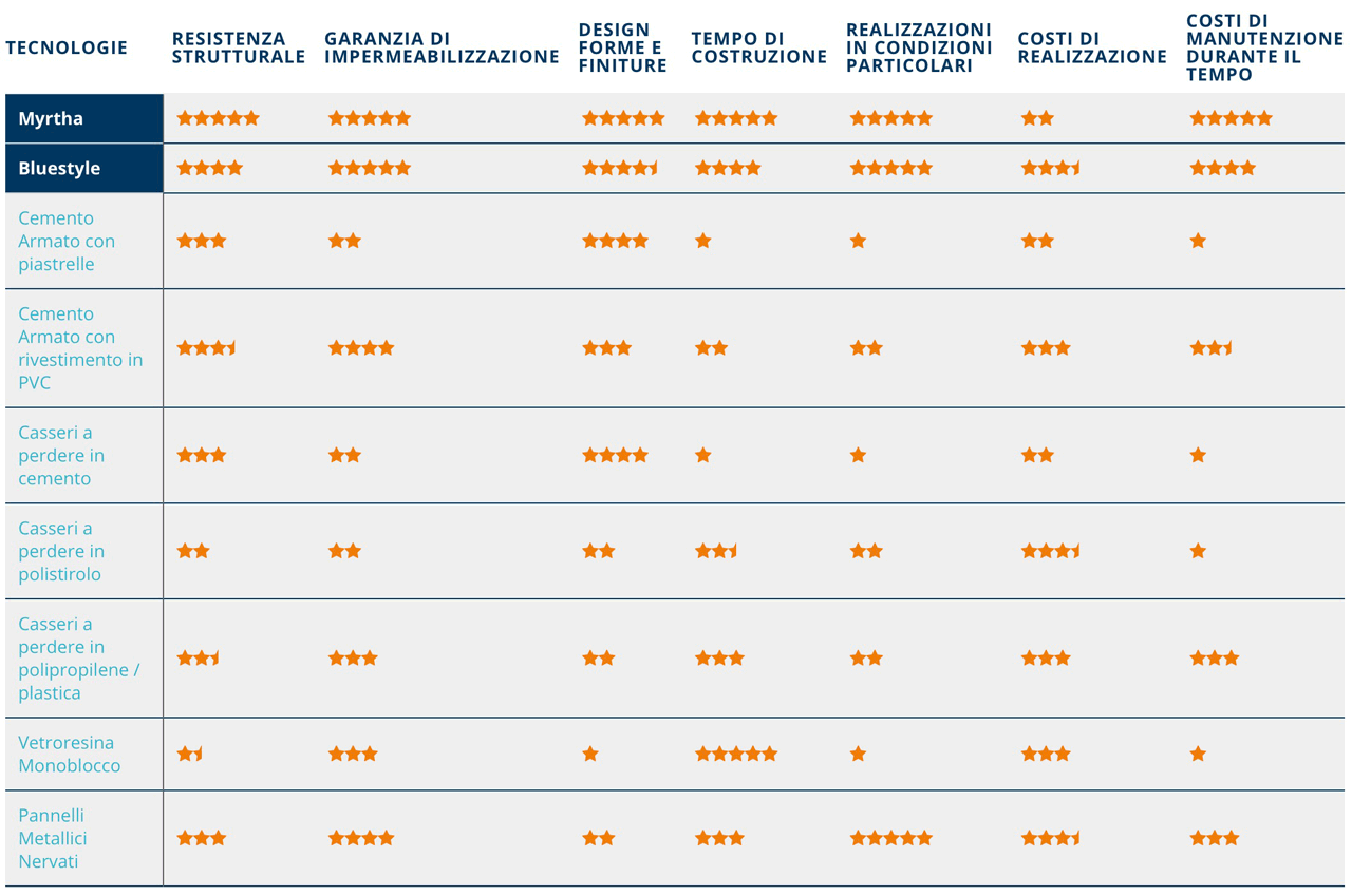 Come si può evince dal confronto, le tecnologie all’avanguada Piscine Castiglione sono le uniche a colmare ogni singola debolezza che è propria dei metodi costruttivi tradizionali. In un mercato dove l’offerta arriva spesso da imprese edili, che propongono solo ciò che conoscono, il cemento armato è ancora vissuto come la migliore soluzione possibile. Come risultato, negli ultimi anni, è aumentata a dismisura la richiesta di Clienti che necessitano di importanti ristrutturazioni su vasche in cemento armato degradato. I costi di una piscina in acciaio non si discostano di molto dal cemento, ma nel secondo caso non esiste una garanzia duratura nel tempo. A voi la scelta.